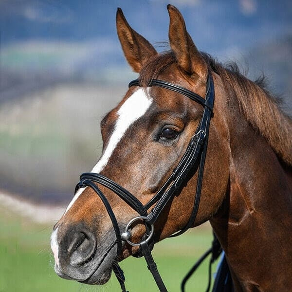 A beautiful Flash bridle from Amerigo with fine leatherwork. The raised browband and noseband set this bridle apart. Comfort headpiece. The horses' head is one of the most sensitive parts of its' body. The concentration of nerves over the poll and around the ears can easily be affected by excess pressure.