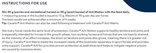 The nutrients in Cavalor Arti-Matrix are more focused on the nutritional support of horses with acute, severe or chronic problems. We recommend using Cavalor Arti-Matrix during the first two months if such problems occur.