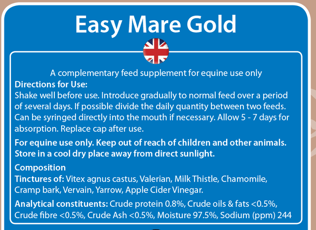 Easy Mare Gold is a liquid supplement containing herbs such as vitex agnus castus and valerian which can help support a mare's normal 21 day cycle. It can be useful for very young or those in poor condition, who can exhibit excessive behavioural and physical signs when they are in season. Early spring can be a difficult time of year and yard changes such as the introduction of youngstock or new geldings can also create behavioural changes, although this can be given throughout the year if required. After initial use, you could go onto its dry equivalent, Easy Mare (we do not suggest you give both together).