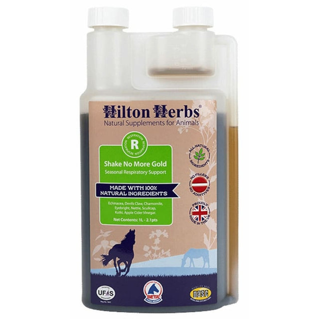 Shake No More Gold is a fast absorbing liquid supplement containing herbs such as echinacea, eyebright and devils claw root to help maintain a resistance to summer irritants. With an increasing reduction in air quality and the increased cultivation of certain crops, many horses are becoming more sensitive and need to be ridden or turned out in nose nets.