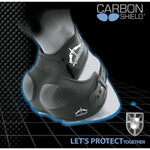 Revolutionary overreach boot designed for a whole and safe protection of the heel area. Anatomically shaped with Extra-carbon protection on the heel bulbs. Double point fastening. Elastic straps. Quick-release tip. Certified protection.