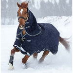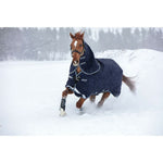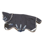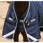Unpredictable weather? No problem! The Rambo® Duo Turnout (100g Outer with 300g Liner) is the ultimate all-season rug you and your horse will love! This all-weather robust 1000D Ballistic Nylon turnout rug offers exceptional waterproof and breathable properties. Complete with a shine-enhancing, anti-static and anti-bacterial lining to keep your horse's skin happy and healthy with use. 100g of cosy Thermobonded fibrefill takes the edge off any chill in the air, and because it comes complete with a removable neck cover, a lightweight 300g liner and further compatibility with the Horseware® liner system range, this rug gives you endless rugging options with just one outer rug. Our unique combination of 'Surefit Neck' Design, 'V-Front Closure' system, dual leg arches and Rambo® Safety Surcingle System combined with PVC wipe clean tail cord and dependable stainless steel hardware ensure your horse is safe, comfortable and protected from the elements during rest and play. This outstanding performance field rug comes with reflective strips for high visibility and with our ten-year standard Rambo® turnout rug guarantee. This rug delivers excellent protection and freedom of movement ! Available in Navy with Sky Blue & Brown in 5'6'' - 7'3'' We are one of the largest independent retailers of Horseware in the UK & a verified premium stockist giving us access to the entire range. Our sales advisors all use these products on a daily basis so are able to offer you expert advice. If you need any assistance in selecting the right item for you or your horse please don't hesitate to contact us. | ||