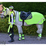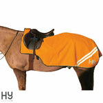 Keep your horse warm and visible with this fantastic showerproof fleece-lined exercise sheet. Perfectly shaped to keep the hindquarters protected from the elements and complete with a tail flap to ensure excellent visibility from behind. It features reflective piping around the edges and a double reflective strip on both sides that also appears across the tail flap, so you are sure to be seen from a distance! This exercise sheet is cut away to fit snugly around the saddle and is shaped around the front to enable the rider's leg to sit close to the horse's side. With touch tape fastenings around the front of the saddle to keep the exercise sheet nice and secure.