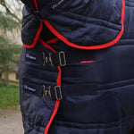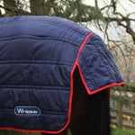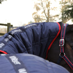 Extra warm 250g fill with double horizontal quilting to retain body heat. Faux fur witherpad to alleviate pressure. Wipe clean PVC coated fillet strap is easy to keep clean and won't rub. Includes flat T-clip chest fastenings with slider adjustment, velcro chest catch and crossed belly surcingles. Classic navy, red and white colour scheme with Whitaker branded straps. Large padded tail cover. Perfect for warmth and versatility in the winter months.