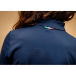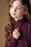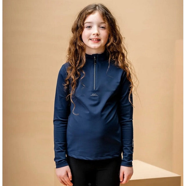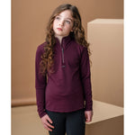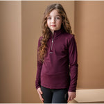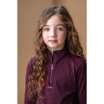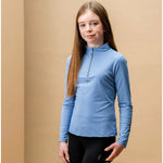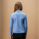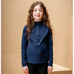 The Sofia is made of recycled nylon, with elastane for stretch. It is luxuriously soft, moisture wicking, and high breathable. With a classic equestrian 1/4 zip and tab collar, this shirt is perfect for lessons, clinics, and cross country runs. The UPF 50+ treatment protects young skin, while the laser cut branding detail looks grown up and sophisticated.