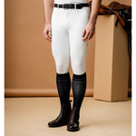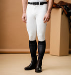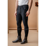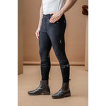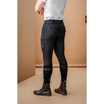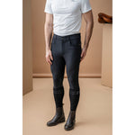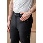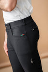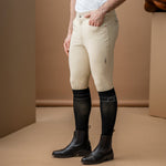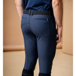 These breeches have silicon knee patches for extra grip and stability in the saddle. The classic rise waist has internal elastic for perfect fit. The fabric is moisture wicking and flexible, with seam free inner leg for maximum comfort. The mesh lower leg offers cooling airflow under boots. Square front pockets. Euro seamed seat. Metal front zip with metal slide closure.