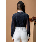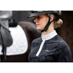 Made of highly breathable and moisture wicking tech fabric, this shirt has a hidden zip placket and stand up collar with magnetic closure. Stock loop at the back on neck. Fitted shape to fit sleekly under a show shirt. Lazer cut print design details for superior airflow.