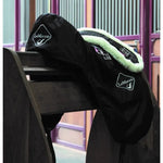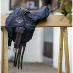 LeMieux ProKit saddle cover is made of a durable, waterproof polyester outer with a soft fleece lining to protect the saddle. Waterproof rating of 3000mm. The adjustable elastic drawstring allows it to fit most shapes and sizes of Dressage saddle for a snug fit, while the over sleeve allows you to keep your girth secure on top of the cover to keep your saddle clean. A lower slot at the bottom on each side is designed to pass the girth straps through for added security.