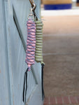This design features a multi-colour weave and a stylish 25cm faux leather tail. It is made of quality, durable woven rope with a robust brushed metal trigger clip.