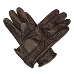 Quality leather gloves featuring elasticated wrist, hook and loop fastening tab with branded embroidery, ventilation holes along the finger and reinforced rein fingers.