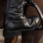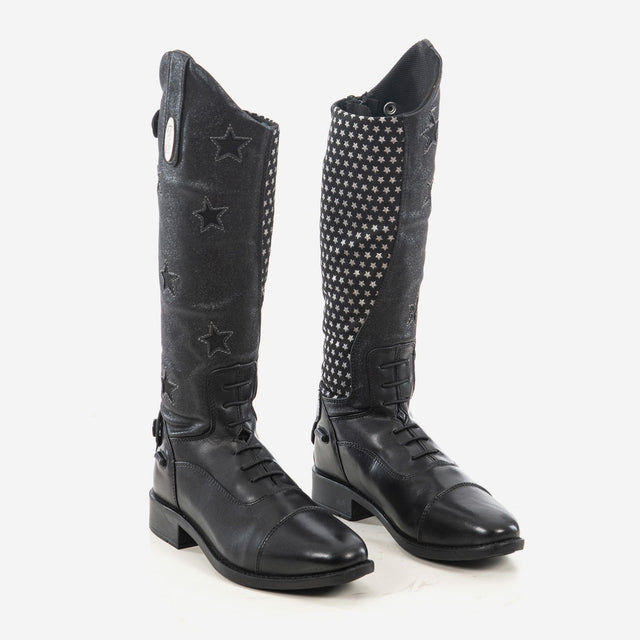 Made from a super-stretchy synthetic leather that is embedded with a dazzling glitter for a big dose of glamour! Genuine leather foot moulds perfectly to the foot for exceptional comfort. The outer calf features embedded sparkle effect that won't rub off or transfer and a punched star design with suedette inner. The 3D stretch synthetic leather calf is easy to maintain and keep clean. Featuring a full length rear zipper with laced pull-tab for easy on and off and the inner of the calf is made from a suede and features sparkly silver silicone stars for extra grip, making this boot perfect for younger riders. A leather zip cover at the heel and zip stop at the top of the boots protect the zipper and stop it falling down.