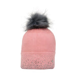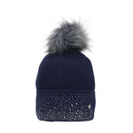 A glamorous close knit bobble hat beautifully finished with a banded cluster of delicate diamantes across the front of the hat and faux fur bobble.