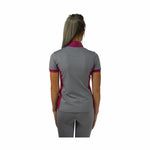The technical materials are combined with a flattering design for the best look. The grey shirt is enhanced with pink panels on the side of the body that match the trim on the sleeves and collar.