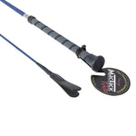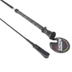 Dressage whip, 39' woven fabric stock with easy-grip twisted rubber handle. Plastic mushroom cap and leather keeper.