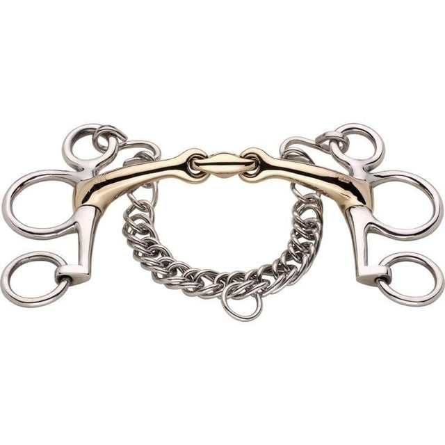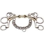 Pelhams can be used with one or two reins, which enables different rein options. Direct pressure is applied to the horse’s tongue and bars if the rider only uses the snaffle rein. If horses tend to toss the head it makes sense to attach a second rein to the lower cheek piece ring to apply pressure on the horse’s poll. The horse will try to dodge this pressure by lowering the head. The curb chain should come into play at maximum angle of 45° (lower cheek to horse’s mouth) to avoid the horse lowering its head too much.