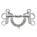 The Pelham is a bit that provides additional lever action on the poll. Pressure is applied to the lower jaw bones by the use of a curb chain. In a way the Pelham is a combination of a Weymouth and a bradoon. Pelhams can be used with one or two reins, which enables different rein options. Direct pressure is applied to the horse’s tongue and bars if the rider only uses the snaffle rein.