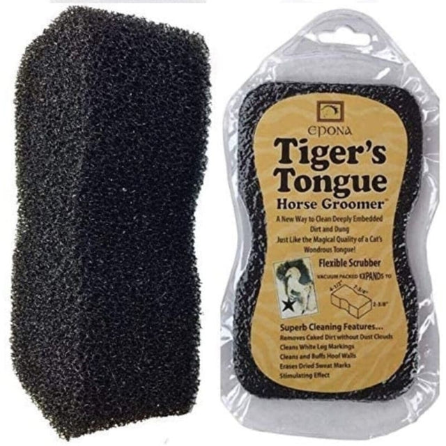 Tigers Tongue is a grooming aid that is effectively a sponge, curry comb and brillo pad all in one. It can be used dry or wet with shampoo which is good for white socks, legs, pasterns and hooves. It has a massaging effect around an animals head and is superb at removing sweat marks, stains and dried in dirt.