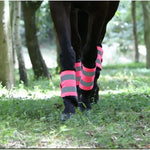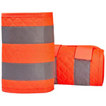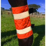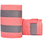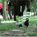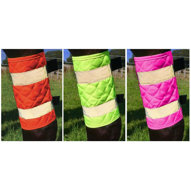 These stylish quilted boots can be fitted over brushing boots. They are made from a strong and durable, yet soft, fluorescent waterproof fabric with two 2' reflective bands stitched on top of each boot. As they will invariably get very muddy, we have made sure they can be popped into the washing machine, or into a bucket of water time after time and still come out looking brand new. When the horse wears them on all four legs, they look fantastic and best of all, the movement of the legs really catches the driver's eye. They are one size because they are so adjustable. They can fit a 12.2hh with brushing boots on and go up to a 18hh, just cut off the fastening you don't use.