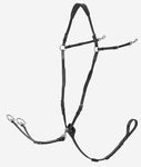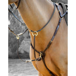 The padded cushioning behind the connector on the chest adds to the comfort for the horse, featuring a removable running martingale attachment with handy clips, durable metal fixings and easy to use buckle closures. The custom designed martingale rings clip on and off reins easily without the need to undo them.