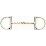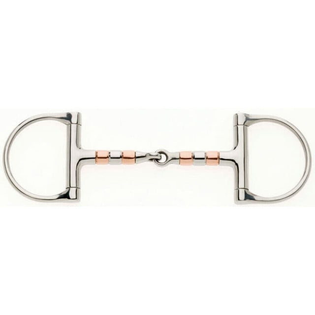The alternating stainless steel and copper rollers set along the mouthpiece of the snaffle, allow the bit to roll up the mouth, and help to prevent the horses from grabbing it between the teeth.