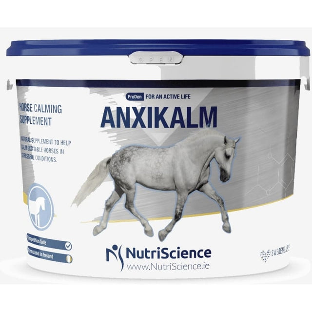 One of the best selling competition legal calmers on the market. Suited to a large cross-section of horses & ponies. Strong powder combination of Magnesium and L-Trtpotophan helps calm excitable horses under stressful situations such as competition, travelling and training. Very effective and economical. Problems: Constantly nervous Easily distracted Nervous when traveling or clipping Nervous when at sales or competitions Results: An immediate calming effect Does not affect performance Reduces risk of panic Reduces risk of potentially harmful situations Why use AnxiKalm Compete? Some horses are naturally nervous animals and some are affected by particular situations such as travelling, competitions, sales and clipping. Horses have different thresholds in how they react to particular situations and as such they need a supplement flexible enough to adapt to various situations. How AnxiKalm Compete Works The key ingredient of AnxiKalm Compete is L-Tryptophan, this is an amino acid that is converted to serotonin in the body. Combined with Vitamin B it is known to decrease anxiety and reduce the feelings that create stress. Magenesium has a long term calming effect. Magnesium is a key component for ensuring the integrity of nerve endings and the health of the mucus membranes that are key to an individual horse's level of sensitivity. Levels of magnesium can be depleted by stress and anxiety and so need to be replenished.