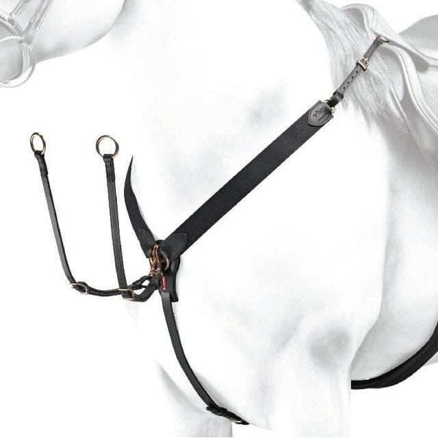 The Equipe V-Check Breastplate is styled in strong elastic with leather fastenings & solid stainless steel or brass buckles. Anatomically designed, elasticised dual straps allow the rider to make adjustments for a precise fit. Featuring a removable running martingale attachment.