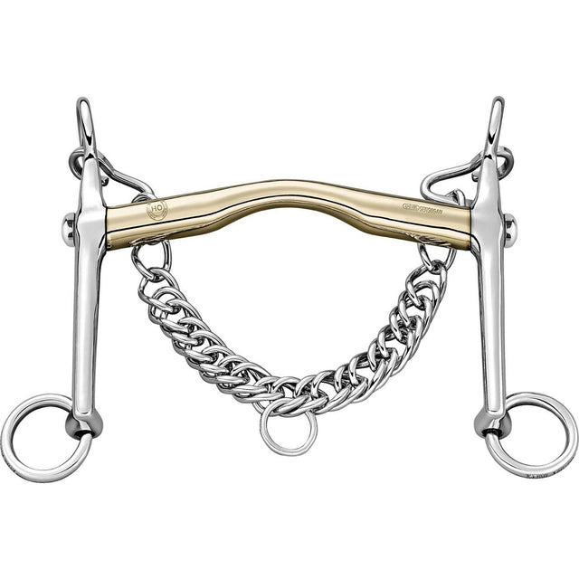 This unique Weymouth with its slanting mouthpiece and a smooth, rounded port is angled forward and enables fine distribution of pressure on the tongue.