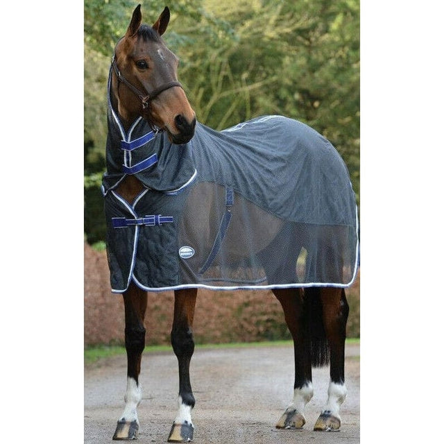 The WeatherBeeta Wick Dri II Cooler Combo neck is a lightweight breathable and higly wickable cooler with mesh covered Cooldry fleece upper to offer additional protection to the major muscle groups and a mesh lower for airflow. A combo neck style with hideaway neck pocket featuring touch tape closure to easily fold the neck portion away to use as a standard neck style. Boa fleece wither relief panel at the wither for additional comfort. Single adjustable buckle front closure, single hidden adjustable surcingle and tail cord.