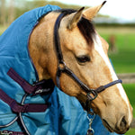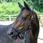 Crafted from high quality leather and contrasting navy blue rope accents for comfort and control. Quick release throat clip and fully adjustable on the nose and headpiece. Includes stainless steel hardware.